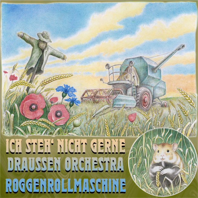 Ländliches Covermotiv für unseren Krach: Der Mähdrescher ist ein Fantasiemodell. (Das nur für die Harten vom Lande. Die sammeln und restaurieren gern altes Geraffel.) Auch der Acker sieht Heute meist anders aus. Dort steht fast immer Mais. Wenn es einen „Blühstreifen“ gibt, wächst da alles mögliche. Kornblumen und Mohn sind selten. Auch die alten Weidetore aus Holz seh ich kaum noch. Und wenn ich eine Vogelscheuche will, müsste ich mich schon selber da hinstellen.