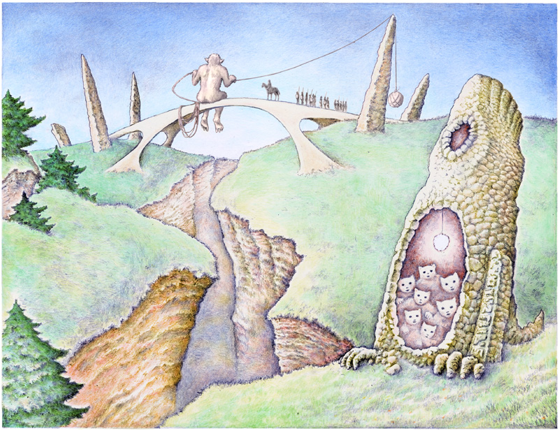Grumpfi ist eigendlich ein gemütlicher Typ. Jedenfalls für einen Brückentroll. Aber immer, wenn er mal was richtig Tolles machen wollte, quatschte ihn jemand blöd von der Seite an. Fast hätte er das Tragseil erfunden, aber es kam nicht dazu. Er musste sich ja wieder aufregen und danach hatte er alles vergessen.